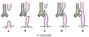 先天性食道閉鎖症は食道が途切れている病気です。5000人にひとり程度(日本では年間200人程度)発生する病気で、原因ははっきりしていません。あかちゃんの体がつくられてくる途中で、気管と食道が分離するときに何らかの異常が起きて発生するといわれています。このため、気管とつながりがあることが多く、そのつながりを気管食道瘻といいます。図1のように5つの型に分類されますが、最も多いのはC型で、85%程度がこの型です。次に多いのはA型で10%を占め、残りの3つはまれです。E型は、食道の閉鎖はありませんが、この病気に含めて考えます。単に気管食道瘻という病名で呼ぶこともあります。